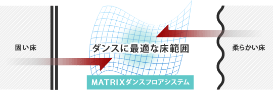 20年後のダンサーの足を支えるをコンセプトに、数多くの施工実績・経験から考え出した弊社オリジナルの床システム”MATRIXダンスフロアシステム”に基づき、ダンスの種別や使用環境に応じた床づくりを目指します。
